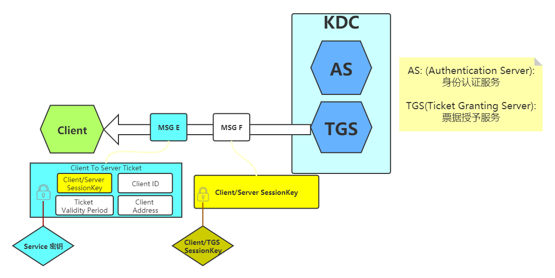 而Msg E使用了 [Service密钥] 加密,该消息可视作是TGS给Service Server的消息,只不过由Client一起携带发送给Service Server